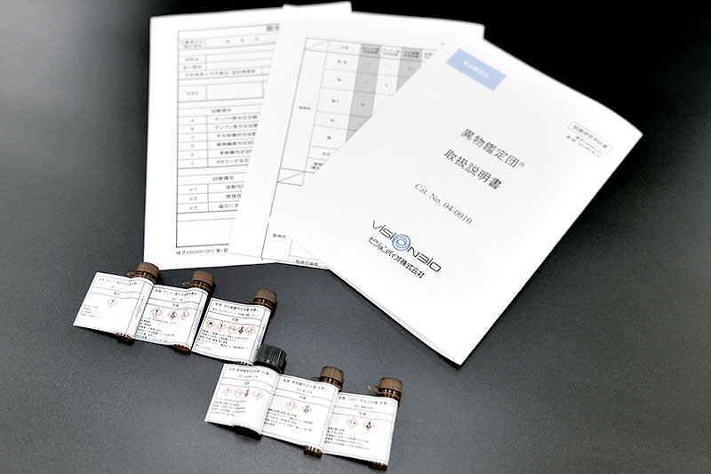 「異物鑑定団」は、食品の製造・検品段階で異物を迅速に検出・調査できる検査キット。異物の簡易検査試薬6種類をセットにした「呈色試薬セット」と、付着物が血液かどうかを判別する「血痕判別試薬」の2種類をラインナップしている。「調査をすばやく、簡便に実施できる検査キットです」(同社)。