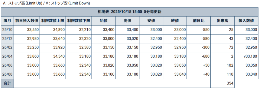 10月15日の堂島コメ平均(先物)/10~4限月が急落、12月限は32,400円に