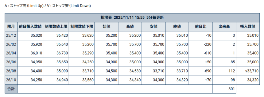 11月11日の堂島コメ平均(先物)/来年8月限がストップ安、33,000円台に