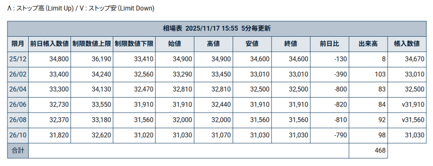 11月17日の堂島コメ平均(先物)/全面安止まらず、6~8月限はストップ安