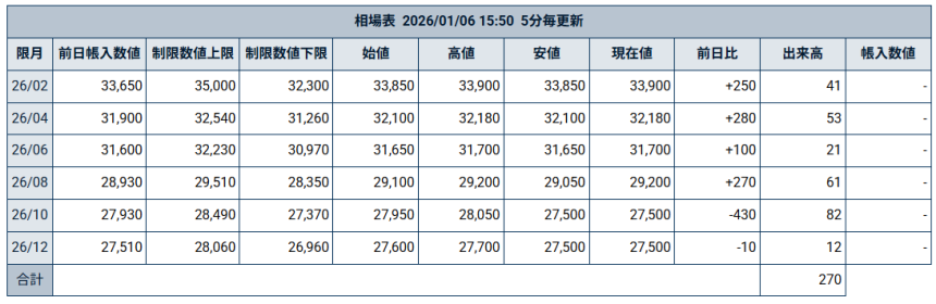 1月6日の堂島コメ平均(先物)/現穀↑・新穀↓