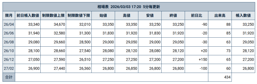 3月3日の堂島コメ平均(先物)/期近↓33,250円、期先↓26,800円
