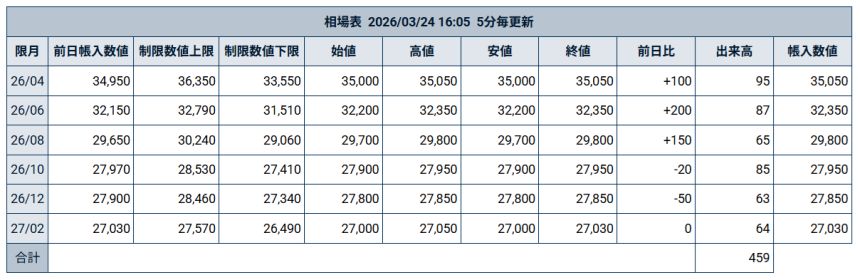 3月24日の堂島コメ平均(先物)/期近続騰で35,050円