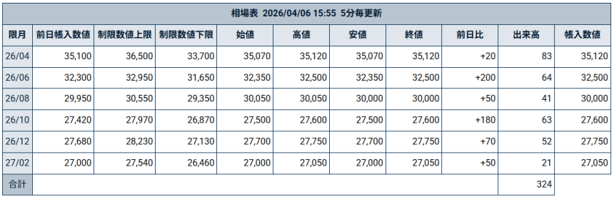 4月6日の堂島コメ平均(先物)/期近↑35,120円、期先↑27,050円