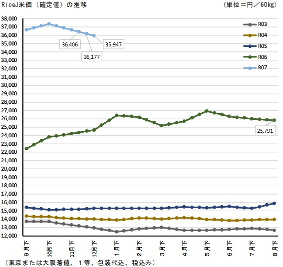 全米販が算出する「RiceJ米価」、令和7年産1月中旬は、「32,375円」(1月上旬比▲743円、前年同期比+6,561円)となった。 12月までの確定値は以下の通り。 「RiceJ米価」は、全米販オリジナルの国内産主食用うるち米価格の指標で、毎月3回(上中下旬)更新する。オリジナルとはいっ […]